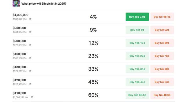 با این حال، طبق بازار پیش‌بینی پولی‌مارکت (Polymarket)، تنها 9٪ از معامله‌گران پیش‌بینی کرده‌اند که قیمت بیت کوین در سال ۲۰۲۵ به 250,000 دلار خواهد رسید، در حالی که 60٪ انتظار دارند بیت کوین در سال 2025 به سقف 110,000 دلار برسد.
